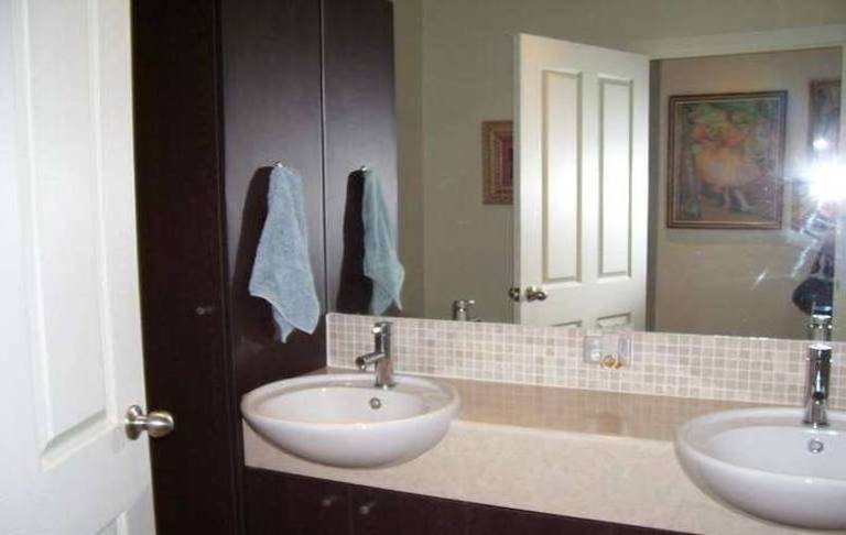 The main bathroom has a dual vanity and is very modern.