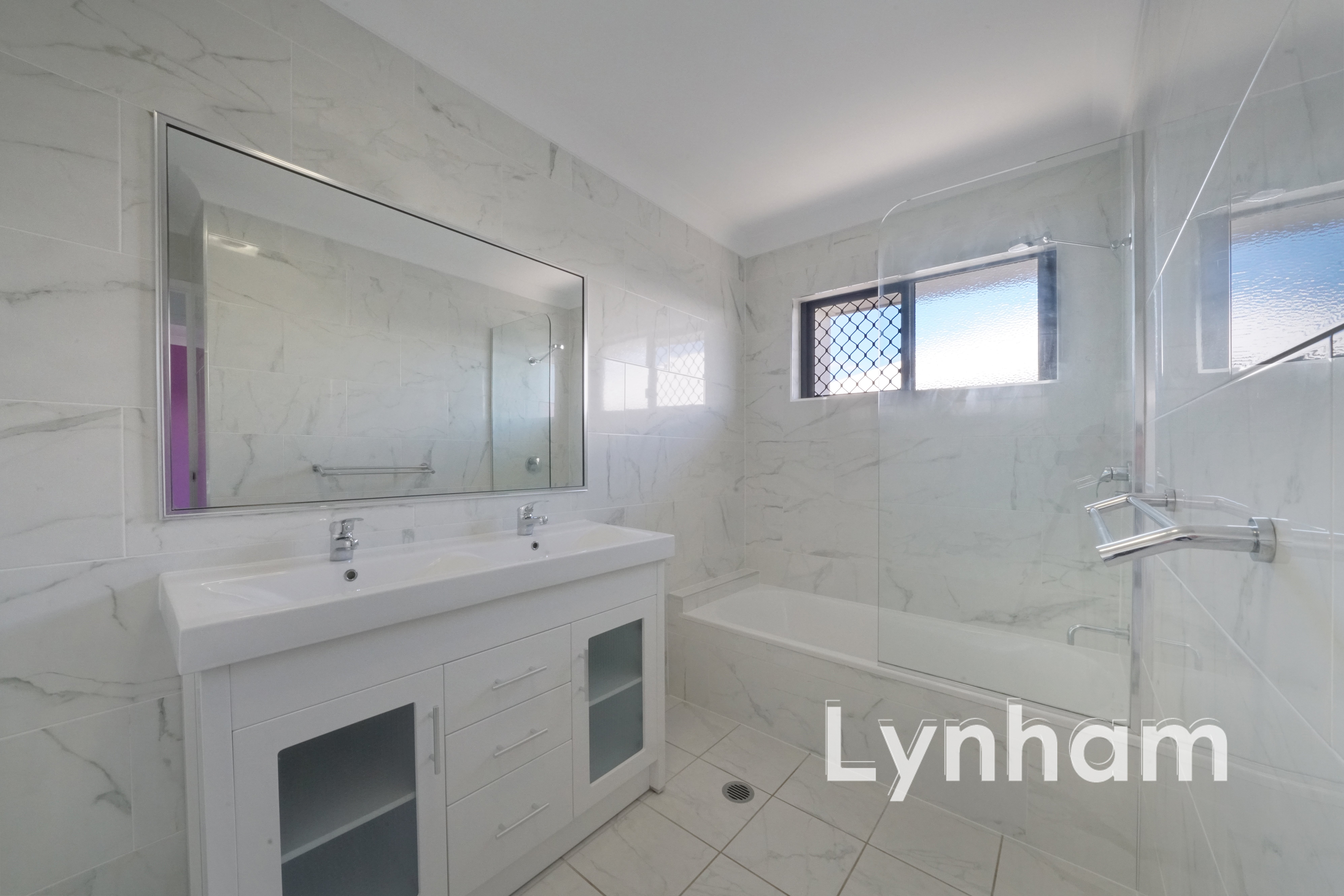 - Large main bathroom with dual vanity, combined shower/bath and separate toilet