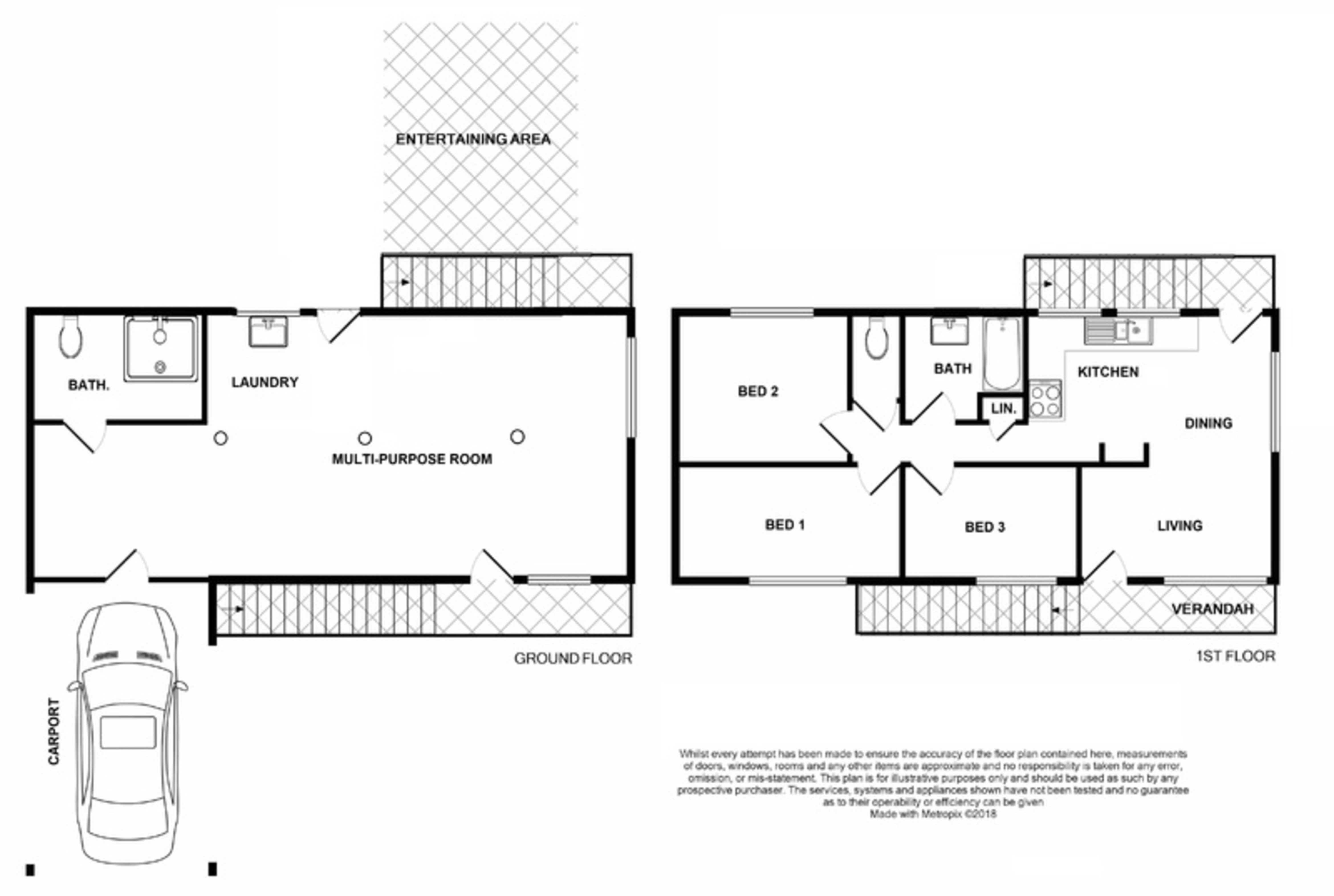 The home features three bedrooms living area and modern kitchen and bathroom upstairs, as well carport and a lockable enclosed area with second bathroom and shower downstairs (not legal height downstairs).