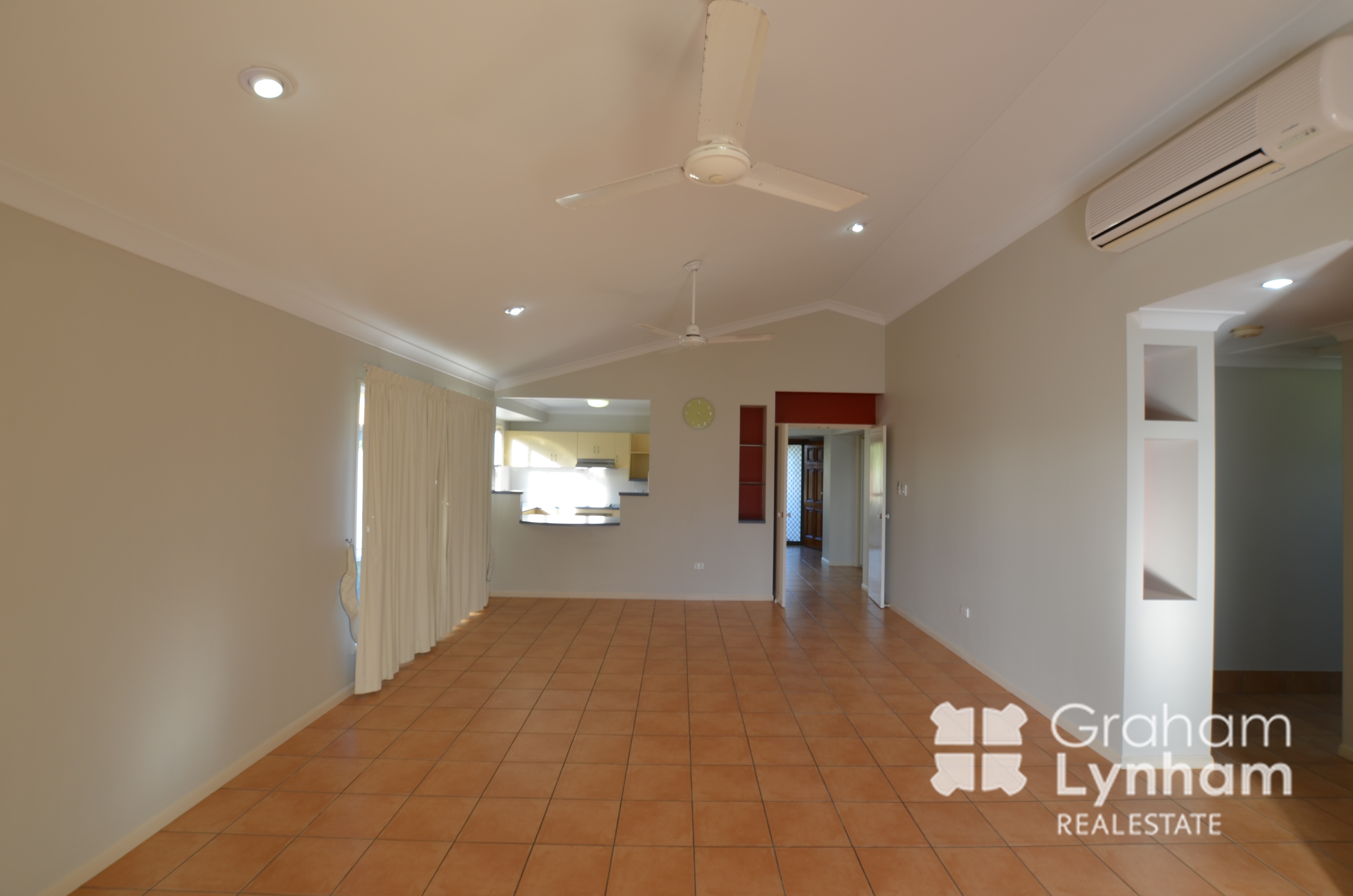 - Large open plan living/dining area with high ceilings