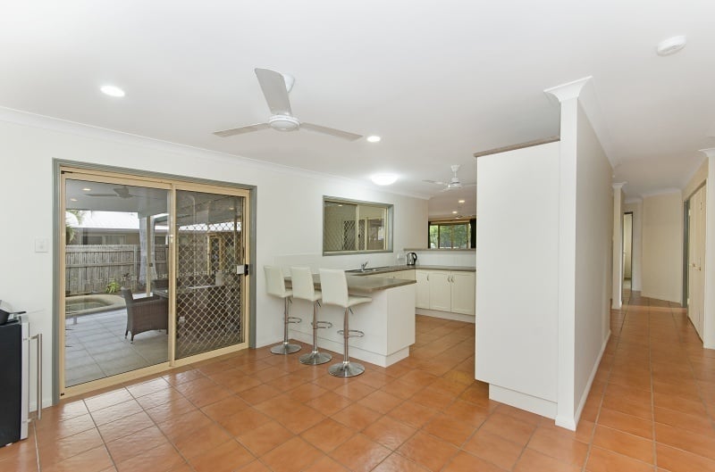 - Large tiled living area and dining separated by the kitchen with new stove.